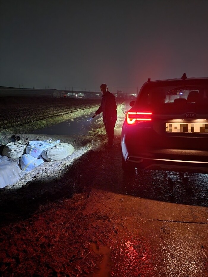 청북읍 자율방재단 백승혁 단장을 비롯한 방재단원 32명이 조별로 근무조를 편성해 관리천 일대 합류지점 둑, 배수로 등에 순찰을 진행하고 있다.