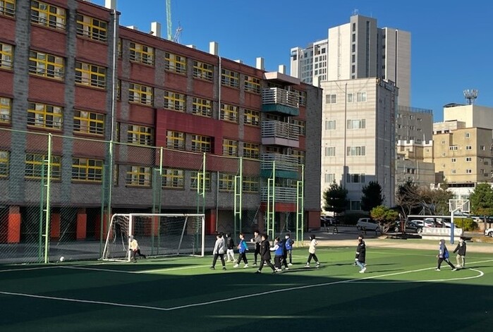 축구 교실은 4학년 정규 체육수업 시간을 활용해 운영되며, 8차시에 걸쳐 드리블과 패스, 스로인 등 기본기 습득과 함께 팀별 전술훈련도 진행해 남녀 모두 흥미를 가지고 참여할 수 있다.