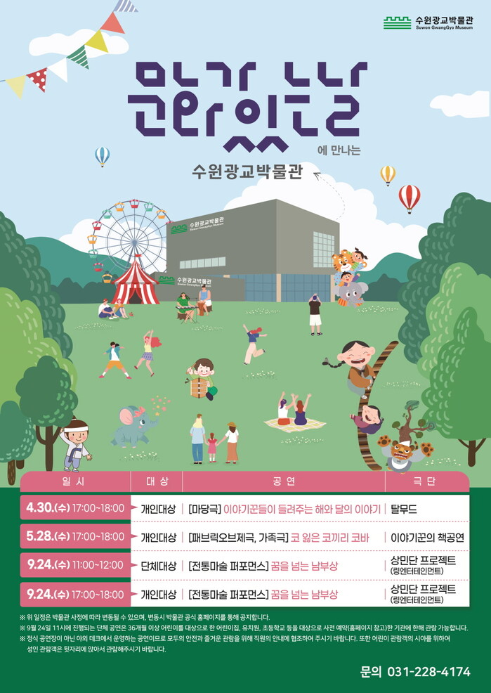 매달 마지막 주 수요일, 문화가 있는 날은 수원광교박물관 야외에서 관람할 수 있다. 9월 24일 오전 11시 기관·단체 공연은 8월 18일부터 예약 신청할 수 있다.
