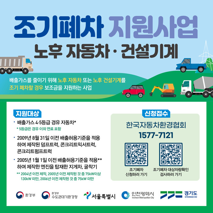 지원 대상은 ▲배출가스 4·5등급 경유차 ▲2009년 8월 31일 이전 배출허용기준을 적용받아 제작된 도로용 3종 건설기계(덤프트럭, 콘크리트믹서트럭, 콘크리트펌프트럭) ▲2004년 12월 31일 이전 배출허용기준을 적용받아 제작된 지게차·굴착기다.