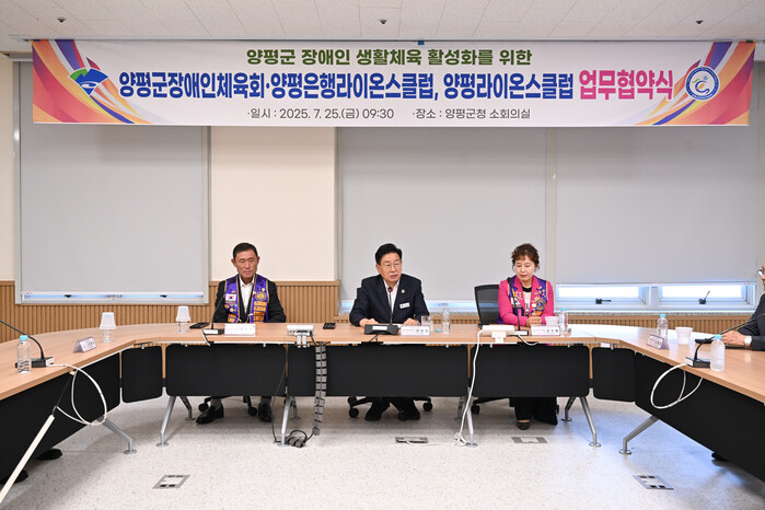 [양평=로컬라이프] 송준형 기자 = 전진선 양평군수는 25일 오전, 양평군청에서 양평군장애인체육회와 양평은행라이온스클럽, 양평라이온스클럽 간 장애인의 건강 증진과 생활체육 활성화를 위한 상호 협력 업무협약식을 가졌다.
