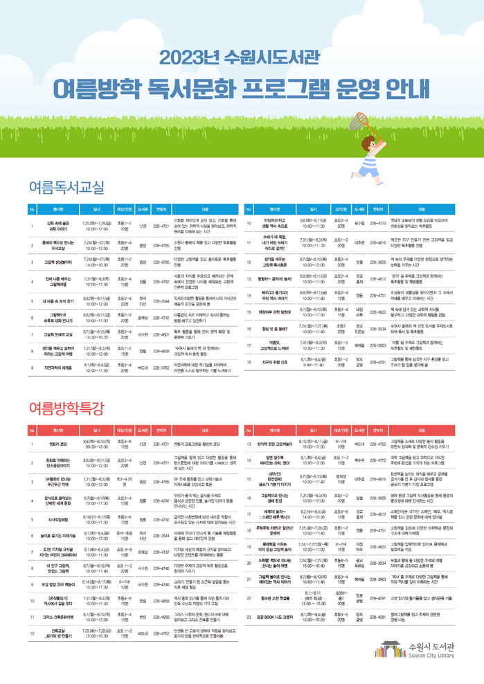 수원시 관계자는 “여름방학을 맞아 어린이‧청소년들을 위해 풍성한 주제의 독서 프로그램을 마련했다”며 “많은 관심과 참여를 바란다”고 말했다.