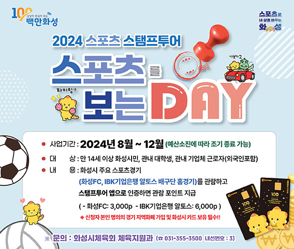 화성시(시장 정명근)가 시민들이 일상에서 스포츠경기를 접하는 기회를 제공하기 위해 ‘2024년 스포츠 스탬프 투어’를 12월까지 운영한다.