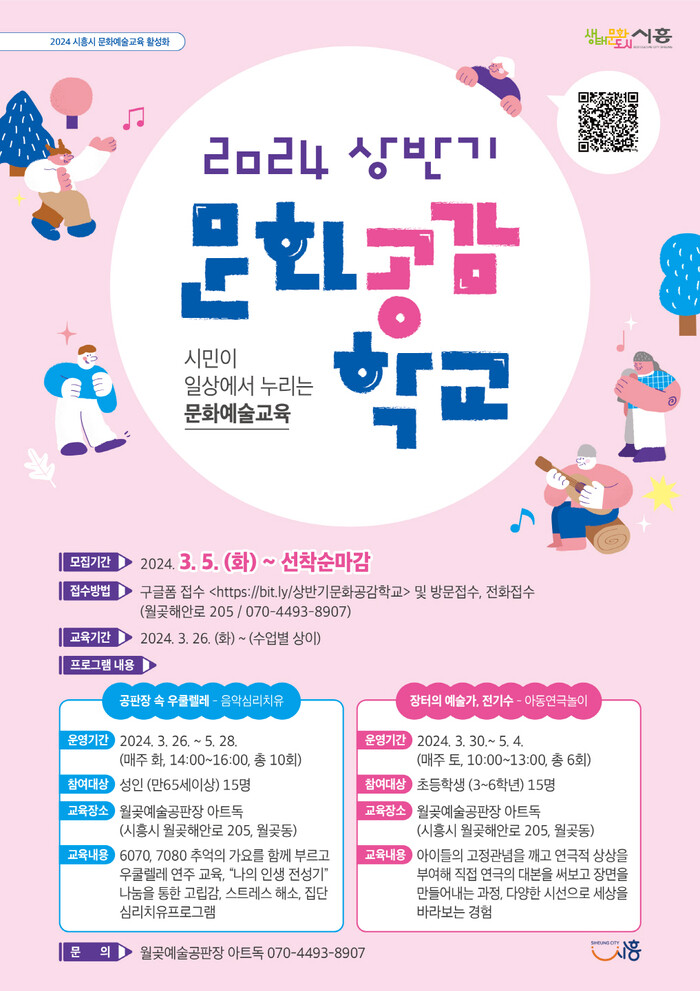 시흥시(시장 임병택)는 시민들이 일상에서 누리는 문화예술교육을 통해 문화 향유의 기회를 늘릴 수 있도록 ‘2024 문화공감학교 상반기 문화예술교육’을 운영하고 참가자를 모집한다.