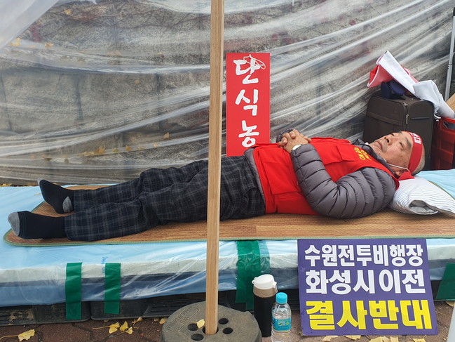 [로컬라이프] 수원전투비행장 화성이전 반대 범시민대책위원회(이하 화성시 범대위) 홍진선 상임위원장의 개정안 규탄 단식 투쟁이 오늘로 벌써 사흘째 접어들었다.