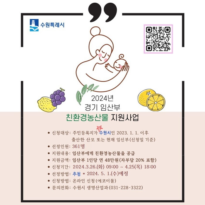 수원시(시장 이재준)가 ‘2024년 경기임산부 친환경 농산물 지원사업’에 참여할 임산부 361명을 4월 25일까지 추가로 모집한다.