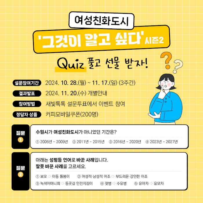 수원시(시장 이재준)가 10월 28일부터 11월 17일까지 ‘여성친화도시 그것이 알고 싶다’ 시즌2 설문퀴즈 이벤트를 연다.