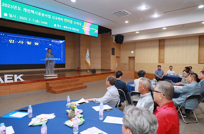 평택시(시장 정장선)는 지난 7일 2023년도 개인택시운송사업 신규 면허대상자 30명에게 면허증을 수여하고 소양교육을 실시했다.