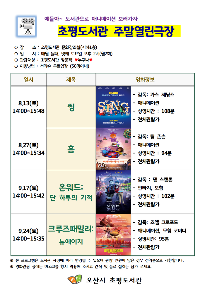오산시(시장 이권재) 초평도서관은 올해 6월부터 지역 시민을 대상으로 ‘주말 열린극장 얘들아, 도서관으로 애니메이션 보러 가자! ’를 운영 중이다.