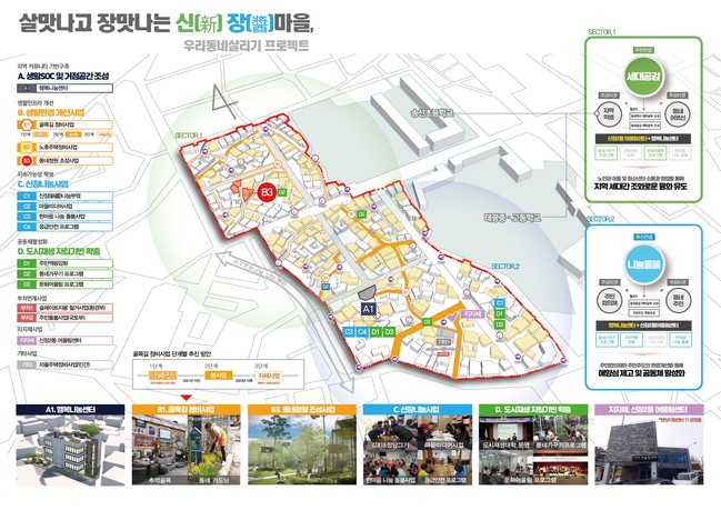 본 사업의 주요내용은 행복나눔센터를 건립하는 생활SOC 및 거점공간 조성, 골목길정비와 동네정원을 조성하는 생활환경개선사업, 신장나눔사업, 주민역량강화 등의 도시재생자립기반 확충 등 4개의 추진전략으로 진행될 예정이다.