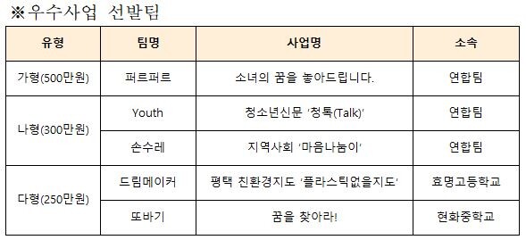 이번 청소년참여예산제는 현장 제안회(현장투표)와 온라인투표를 병행해 918명의 청소년 심사위원이 우수사업 선발에 참여했으며, 최종 5개 팀이 우수사업으로 선발됐다.