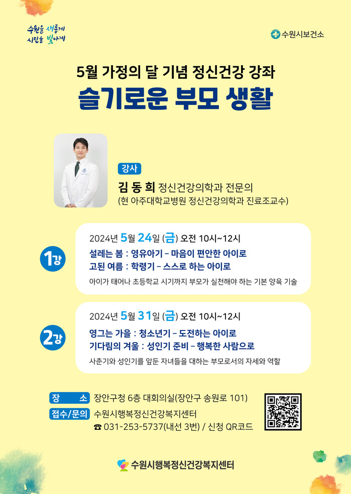 수원시행복정신건강복지센터가 5월 가정의 달을 맞아 ‘슬기로운 부모생활’을 주제로 하는 정신건강 강좌를 장안구청에서 연다. 김동희 아주대학교병원 정신건강의학과 전문의가 강의한다.