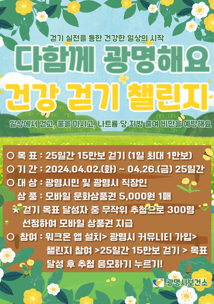 광명시 보건소는 일상 속 걷기 실천 생활화를 위해 ‘2024년 제2회 다함께 광명해요’ 건강 걷기 챌린지를 운영한다.