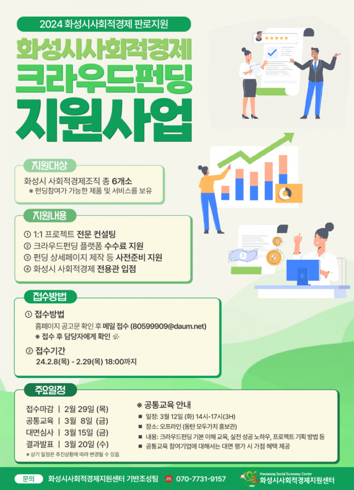 화성시(시장 정명근)가 화성시사회적경제지원센터 주관 ‘2024년 화성시 사회적경제 크라우드펀딩 지원사업’으로 관내 사회적경제기업의 온라인 마케팅 역량 강화와 판로 확대 지원에 나선다.
