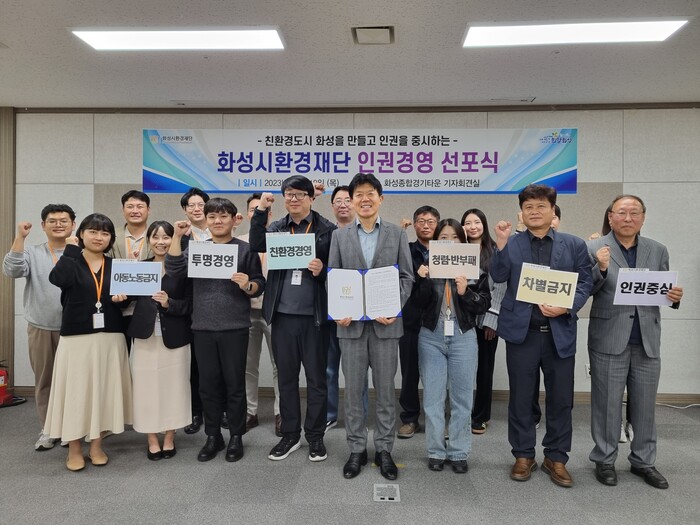 화성시환경재단이 19일 화성종합경기타운 기자회견실에서 정승호 대표이사 및 임직원이 참석한 가운데 ‘인권경영 선포식’을 열었다.
