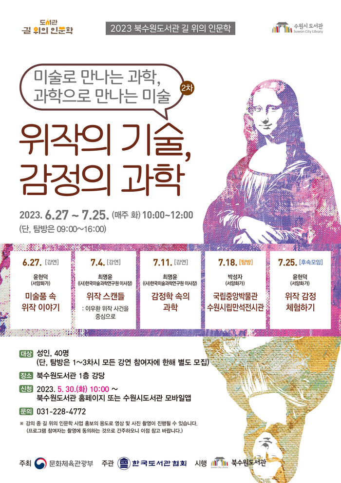 수원시 북수원도서관이 2023년 길 위의 인문학 ‘미술로 만나는 과학, 과학으로 만나는 미술 : 2차 위작의 기술, 감정의 과학’ 수강생 40명을 선착순으로 모집한다.
