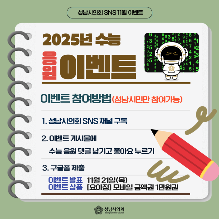 성남시의회가 2025년 대학수학능력시험을 치른 수험생들을 격려하고 사회에서의 새로운 시작을 응원하기 위해 수능 응원 이벤트를 진행한다.