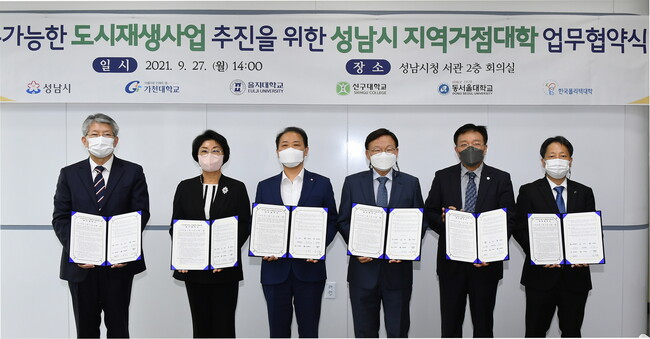 시는 이날 오후 2시 시청 2층 회의실에서 장영근 성남부시장과 최미리 가천대 수석부총장, 박항식 을지대 부총장, 이종욱 신구대 산학협력단장, 유창승 동서울대 부총장, 김광희 한국폴리텍대 성남캠퍼스 학장 등이 참석한 가운데 ‘지속가능한 도시재생사업 추진을 위한 성남시 지역거점대학 간 업무협약’을 했다.
