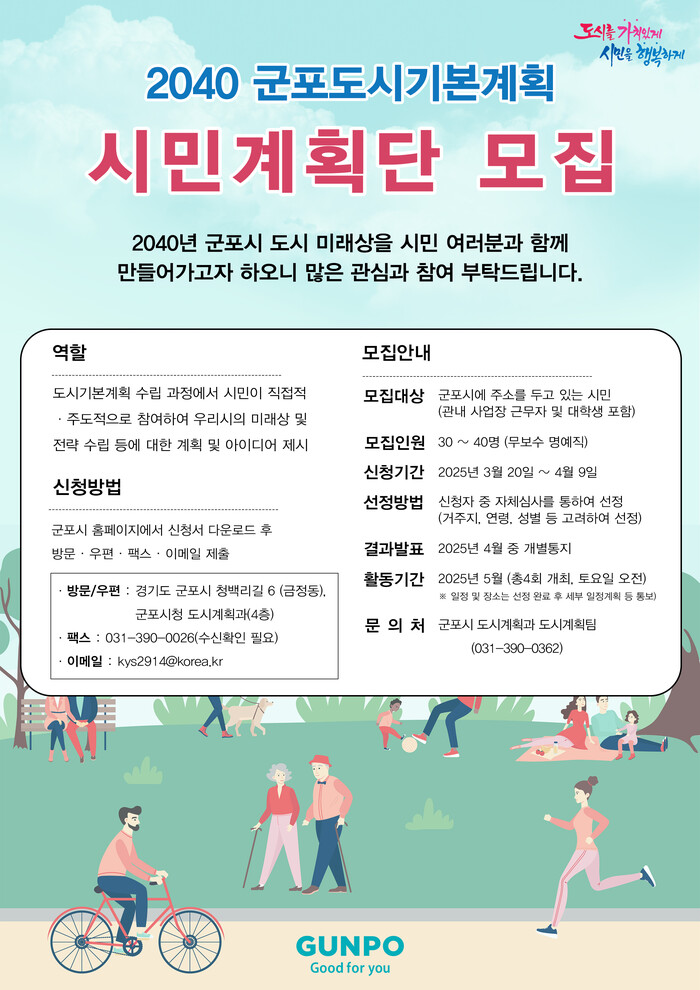 군포시가 2040 군포도시기본계획 수립에 참여할 시민계획단을 3월 20일부터 4월9일까지 모집한다고 밝혔다.