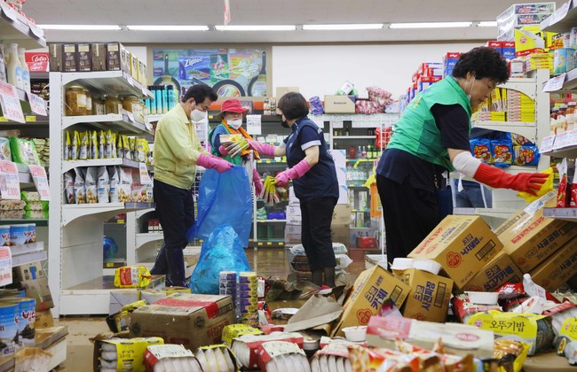 백 시장은 한 식자재마트에서 집중호우로 토사가 유입된 실내를 청소하고 진열됐던 상품을 반품하기 위해 비닐에 담는 등 정리를 도왔다.