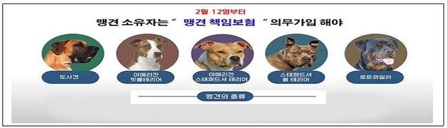 맹견(해당견종은 사진참조)으로 인한 개 물림 사고 등이 발생했을 때 사고 당사자에 대한 피해보상 체계가 미흡하다는 지적에 따라 지난해 2월 11일 「동물보호법」이 개정됐으며 오는 12일부터 맹견 소유자는 ‘맹견보험’에 의무적으로 가입해야 한다.