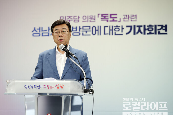 신 시장은 이날 오후 시청 모란관에서 기자회견을 열고 "민주당 중앙당에서 독도 지우기 프레임으로 성남시를 거론하는 것은 지방 사무에 대한 중앙 정치권의 과도한 간섭이며, 92만 성남 애국시민에 대한 모독"이라며 "독도는 지운다고 지워지지 않는 우리 고유 영토"라고 말했다.