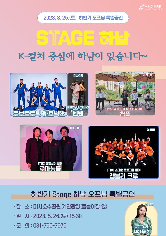 하반기 공연의 서막을 여는 오픈 특별공연은 26일 오후 6시 30분 미사호수공원 계단광장에서 「K-컬처 중심에 하남이 있습니다」를 주제로 개최된다.