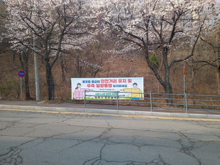 평택시 송탄출장소(소장 오영귀)에서는 시민들이 만개한 벚꽃을 배경으로 안전하게 사진 찍고 산책할 수 있도록 보행자 안전거리 유지 및 우측 통행 안내 현수막과 입간판을 설치했다.