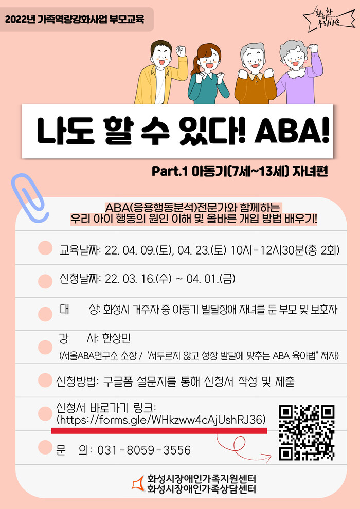 교육 신청은 16일부터 4월 1일까지 화성시장애인가족지원센터 홈페이지(http://www.hsfamily.or.kr)에서 하면 된다.