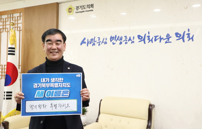 윤 의원의 지목을 받은 염 의장은 이날 의장 접견실에서 ‘경기평화특별자치도’를 새 이름으로 제시하는 팻말을 들고 사진을 촬영했다.