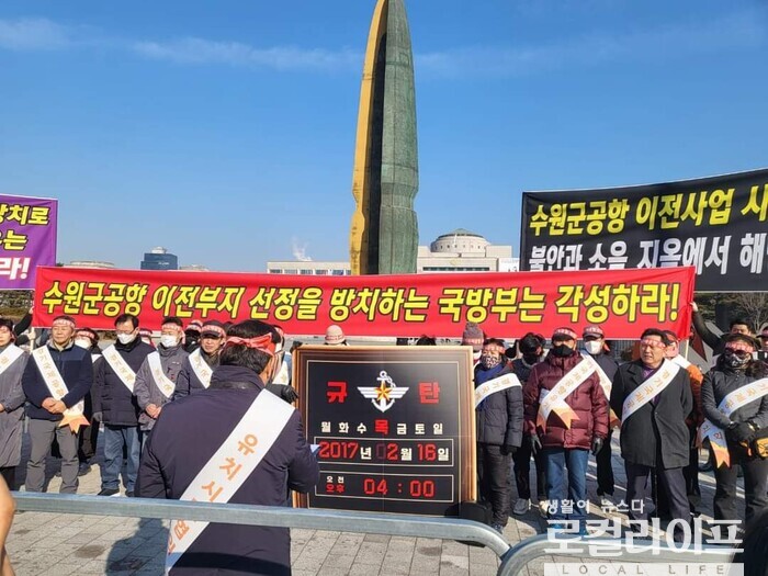 | ▲ 경기국제공항유치시민협의회가 30일 국방부 앞에서 수원 군 공항 이전사업을 촉구하는 집회를 하고 있다. (사진제공=수원시) |