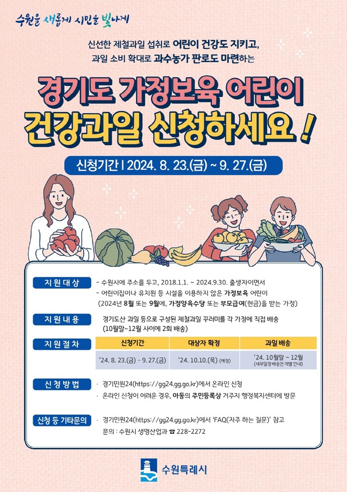 수원시(시장 이재준)가 8월 23일부터 9월 27일까지 ‘2024년 경기도 가정보육 어린이 건강과일 지원사업’으로 과일 꾸러미를 받을 가정보육 어린이를 모집한다.