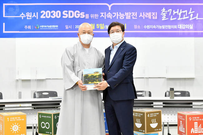 사진/ 5일 오후 4시 더함파크에서 개최된 ‘지속가능발전 사례집 출간보고회’에서 염태영 수원시장이 수원지속가능발전협의회 공동회장인 수산스님으로부터 책자를 전달받고 있다.(사진제공=수원시)