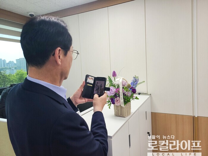 [화성=로컬라이프] 송준형 기자 = 정명근 화성특례시장이 선물 받은 꽃바구니를 소개하며 가족을 위해 꽃 한송이 준비하길 권했다.