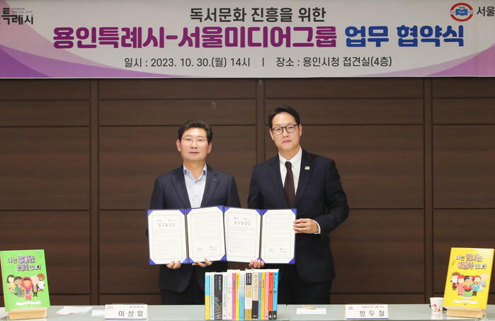 용인특례시(시장 이상일)가 30일 ㈜서울미디어그룹과 함께 도서 기증 협약식을 갖고 시민들의 독서 진흥과 문화 서비스 지원을 위해 협력 관계를 구축한다.