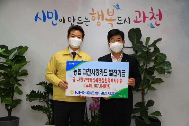 이날 기전달된 기금은 과천시가 업무추진 시 이용한 법인카드와 그린공공요금카드, 복지카드 등의 사용 금액의 1%에 상당하는 금액이다. 시는 전달된 기금을 세입 처리할 예정이다.