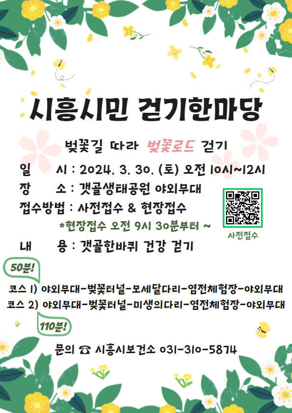 봄을 맞아 시흥시 걷기지도자와 함께 올바른 걷기를 통해 몸과 마음의 건강을 유지하고 걷기의 즐거움을 만끽할 수 있도록 개최되는 이번 걷기 한마당은 갯골생태공원 야외무대에서 행사 당일 오전 9시 30분부터 현장 신청으로 참여할 수 있다.