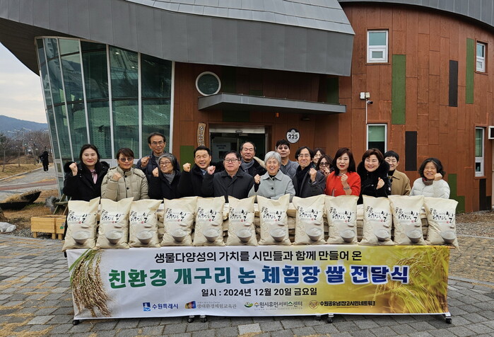 이날 기부한 쌀은 수원시가 생물다양성 체험학습장으로 활용하고 있는 칠보 논 체험장에서 재배해 시민과 함께 수확한 것이다.