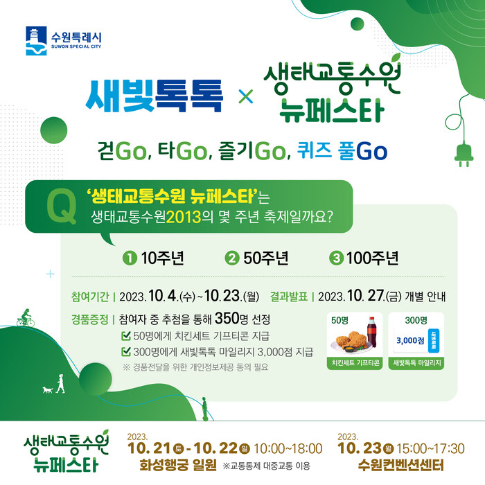 수원시가 ‘생태교통 수원 2013’ 개최 10주년을 맞아 10월 4일부터 23일까지 ‘새빛톡톡 × 생태교통수원 뉴페스타’ 퀴즈 이벤트를 연다.