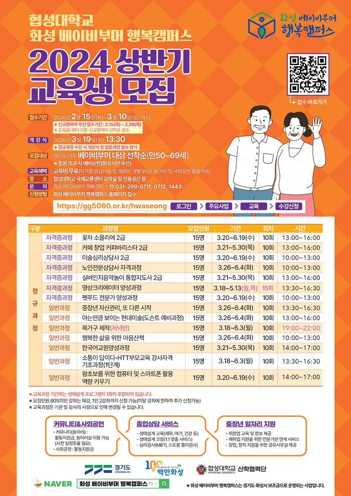 화성시(시장 정명근)가 3월 10일까지 베이비부머 세대의 인생 재도약을 위한 ‘화성 베이비부머 행복캠퍼스’ 2024년 상반기 교육생을 모집한다.