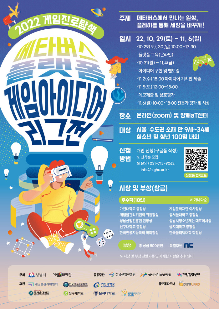 세부 일정은 ▲10월 29~30일=메타버스 플랫폼 전문가의 게임 제작과 사용법 온라인 교육 ▲10월 31일~11월 4일=개별 게임아이디어 구현과 제작 멘토링 ▲11월 2일=게임 아이디어 기획안 제출 ▲11월 5일=시험 제작품 제출과 상호평가 ▲11월 6일=전문가 평가와 시상 순이다.