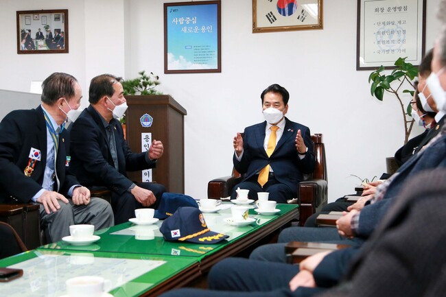 사진/백군기 용인시장이 21일 용인시보훈회관을 격려차 방문해 보훈단체장들과 이야기를 나누고 있다.(사진제공=용인시)