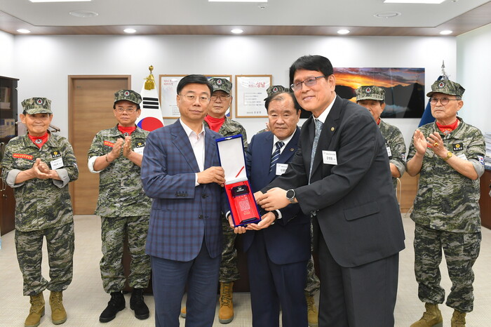 문명철 대한민국 상이군경회 이사,김용환 상이군경회 경기도지부장,송병조 성남지회장등18명은 이날 오후3시30분 시청4층 시장 집무실을 방문해 신상진 성남시장에게 감사패를 전달했다.