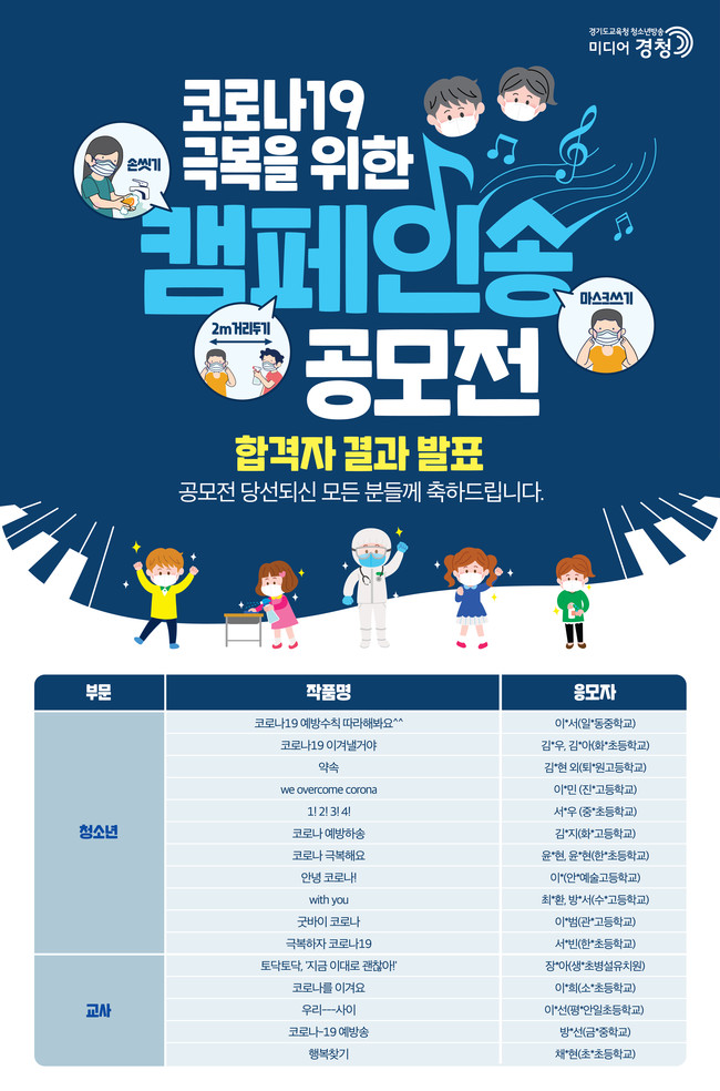 청소년 부문 선정곡은 코로나19 예방수칙을 모두가 함께 지키길 바라는 마음을 담은 이예서 학생(일산동중)외 5명의 ‘코로나19 예방수칙 따라 해봐요’를 비롯해 코로나19 이겨낼 거야, we overcome corona, 코로나 예방하송 등이다.