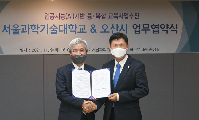 곽상욱 오산시장은 9일 서울과학기술대학교 이동훈 총장과 양 기관이 AI(인공지능) 융·복합 교육 추진을 위해 적극 협력한다는 내용의 상호 업무협약을 체결했다.