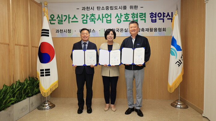 과천시는 지난 23일, 시장 집무실에서 사단법인 한국온실가스감축재활용협회, 탄소포집기술 전문기업 ㈜빅텍스와 온실가스 감축 사업 추진을 위한 상호협력 협약을 체결했다.