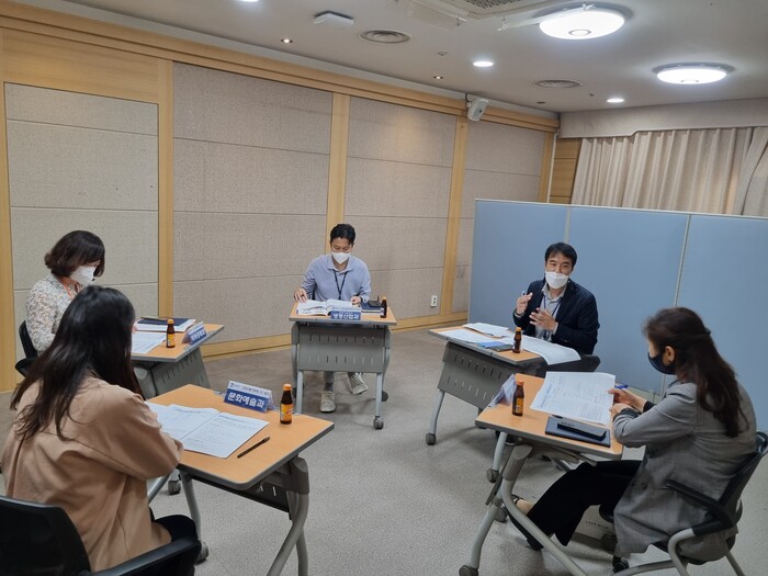 사진/고향사랑 기부제 TF 답례품 분야 팀장들이 회의를 하고 있다.(사진제공=수원시)