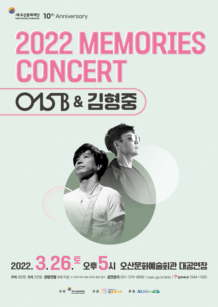 재단 창립 10주년을 맞은 오산문화재단이 “그 때 그 시절, 그 때 그 노래”라는 기획으로, 대한민국 대중음악의 르네상스인 1990년대를 대표하는 한국 대중가요 최초의 프로듀서 그룹 공일오비(015B)와 감성발라더 김형중이 출연 하는 <2022 MEMORIESE CONCERT>를 오는 3월 26일(토) 오산문화예술회관대공연장에서 개최하여 관객들의 마음을 매료시킬 예정이다.