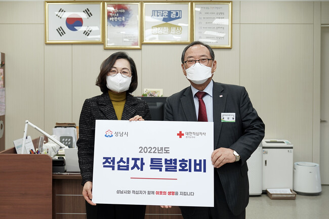 은수미 성남시장은12월22일 오전 시장 집무실에서 윤신일 대한적십자사 경기도지사 회장에게 적십자 특별회비를 전달했다.