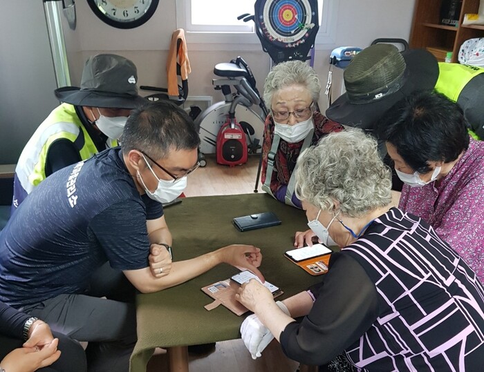 사진/행궁동 경기행복마을관리소 관계자가 경로당을 찾아 어르신들에게 스마트폰 보안에 대해 설명하고 있다(사진제공=수원시)
